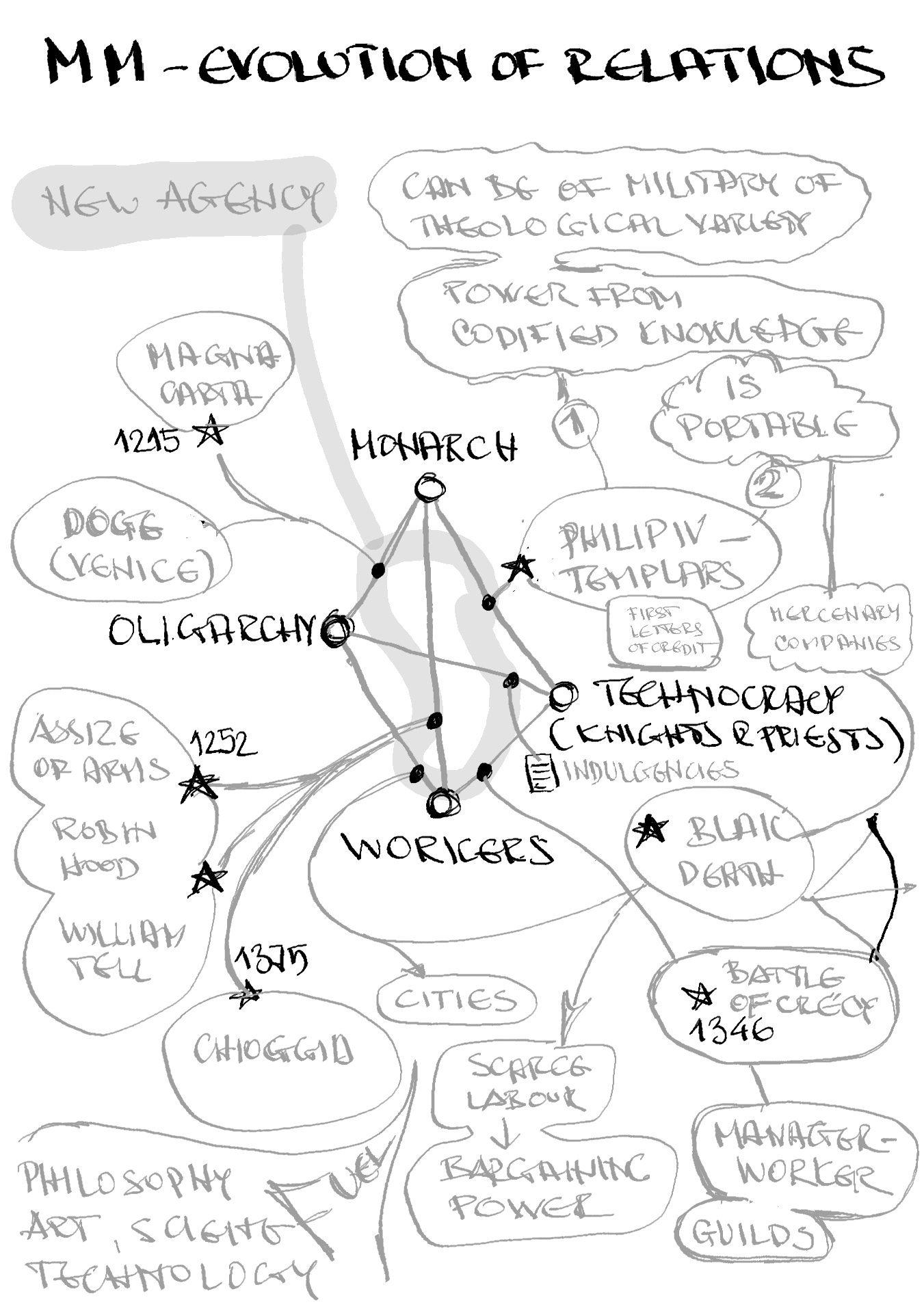 The Modernity Machine functions through restructuring the relations between four classes: the monarch, the oligarchy, the technocracy, and the workers. The balance of power shifts towards previously weaker parties. There are often setbacks, but the trend persists. The previously suppressed class gains persistent new agency. I tried to sketch that in my notebook: