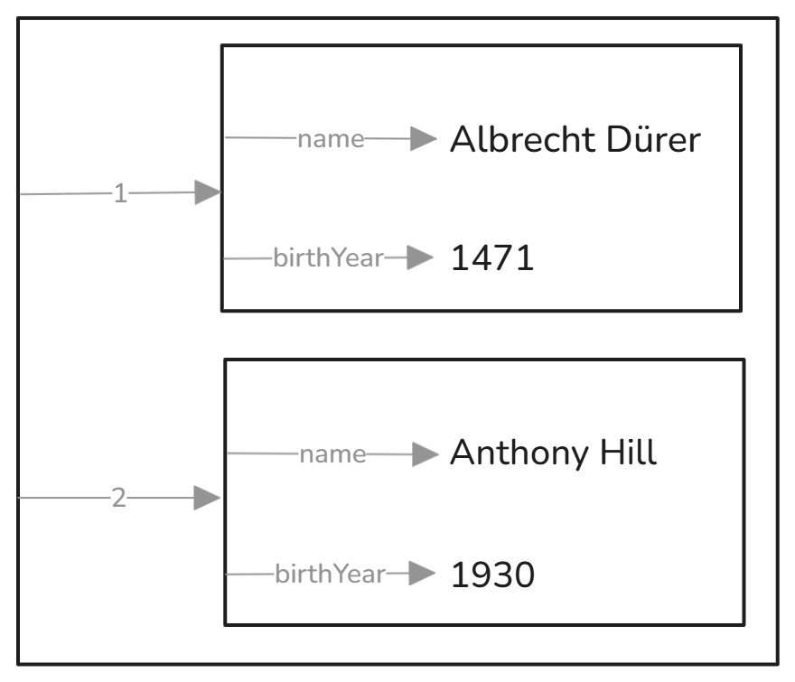 Every CSV file is an ordered sequence of records where each record is an ordered sequence of values. The first record in this example contains headers. Façade-X (SPARQL Anything) has a parameter telling it if the table has headers. Then it will see this CSV as a container containing two containers, each containing key-value pairs with keys, constructed from the headers and values, the respective fields. Here’s how this looks: